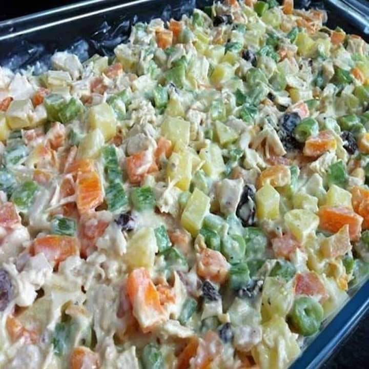 Em uma tigela ou bowl coloque todos os ingredientes: frango, cenoura, batata, tomate, pimentão, uvas passas e a mistura de maionese. Misture bem e prove. Acerte o sal se necessário, coloque pimenta do reino moída na hora e mais um punhado de azeite. Misture novamente.