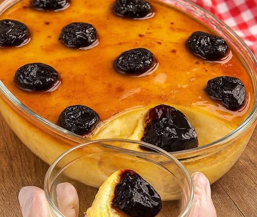 4. Após gelar, desenforme cuidadosamente e cubra com o restante da calda com ameixas.