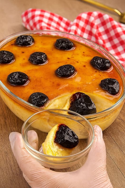 4. Após gelar, desenforme cuidadosamente e cubra com o restante da calda com ameixas.