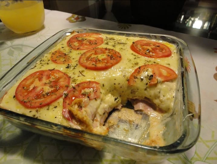 Coloque metade do molho de tomate temperado,as fatias de presunto, uma camada de requeijão, metade da mussarela, o restante do pão de forma, o restante do molho de tomate, o creme de leite, o restante da mussarela, o tomate em rodelas e o orégano.