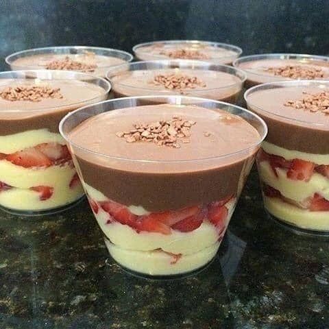 Decore com os morangos que haviam sido reservados. Leve à geladeira. Fica muito bonito se feito em taças para porções individuais.