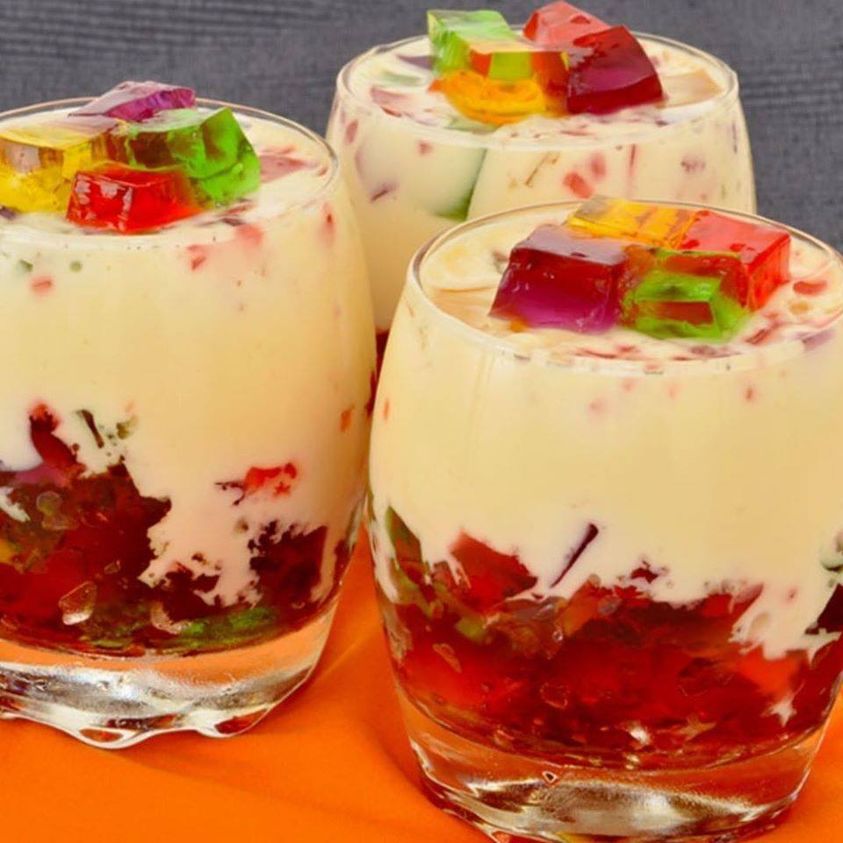 Decore com a gelatina misturada restante e leve à geladeira por 2 horas. Retire e sirva em seguida