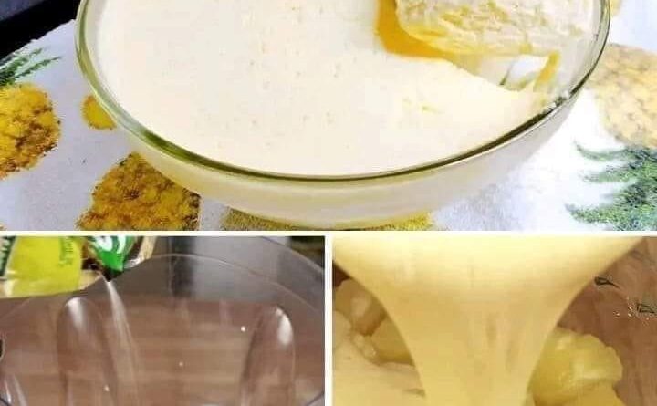 Em um refratário coloque o abacaxi picado e por cima dele coloque o que foi batido no liquidificador. Leve à geladeira até ficar bem firme.