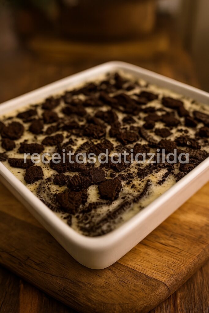 Aqui o segredo é usar o biscoito por completo — massa e recheio — para dar sabor e textura. A base é feita com leite condensado, creme de leite e gelatina incolor, garantindo cremosidade e aquela firmeza perfeita para cortar em pedaços. E claro, os biscoitos triturados entram na mistura para criar aquela crocância deliciosa.