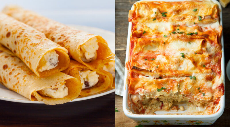 Pegue as panquecas, coloque uma fatia de mussarela e uma porção de carne e enrole. Faça esse processo com todas as panquecas. Jogue um pouco de caldo no fundo de um refratário para untar. Coloque as panquecas já prontas no refratário e despeje sobre elas o resto do molho. Polvilhe sobre as panquecas queijo ralado. Leve ao forno pra gratinar em fogo médio por mais ou menos 15 a 20 minutos ou até ferver o molho e derreter o queijo. Sirva em seguida.