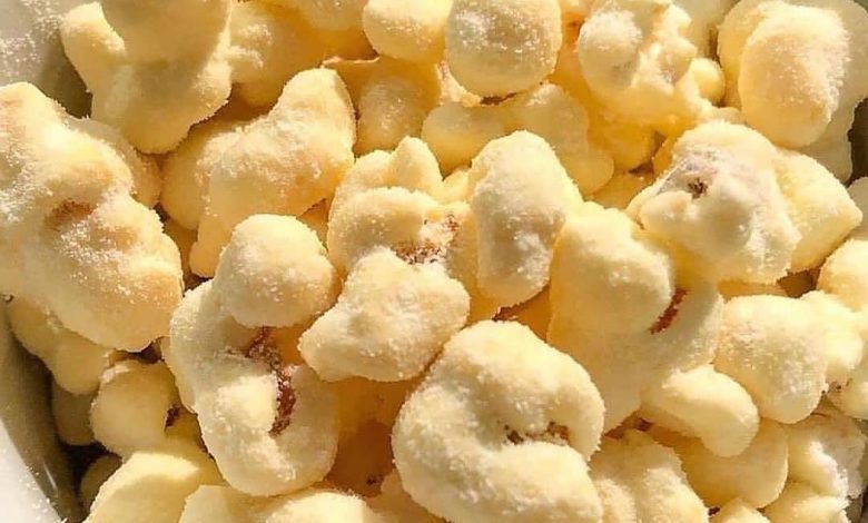 Agora, coloque a pipoca já pronta em um recipiente e despeje a cobertura/chocolate branco derretido por cima e vá misturando até que todas as pipocas tenham sido cobertas pelo chocolate.