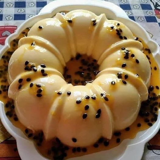 Despeje a mistura em uma forma de buraco central untada com algumas gotas de óleo. Leve à geladeira de um dia para o outro. No dia seguinte, desenforme, cubra com a calda de maracujá e sirva.