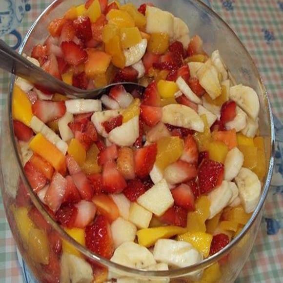 Pique todos os ingredientes, a laranja em pedaços menores que as outras frutas, depois ela solta o caldo e a salada não fica tão ácida