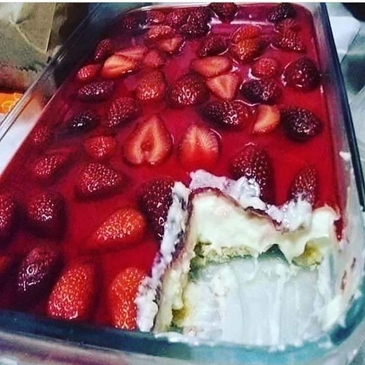 Despeje o creme em uma forma, corte os morangos ao meio e monte em cima do creme. Prepare a gelatina com menos água, 150 ml de água fervente e 150 ml de água fria.
