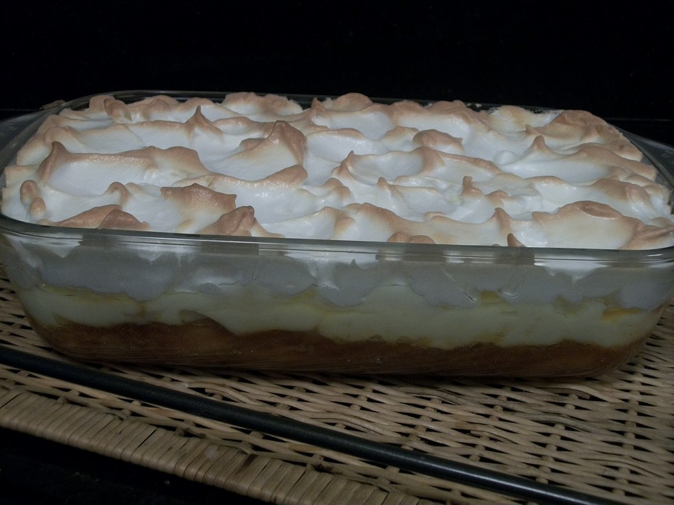 - Levar ao fogo os ingredientes do creme e colocar sobre as bananas bater as claras em neve com o açúcar e colocar em cima.