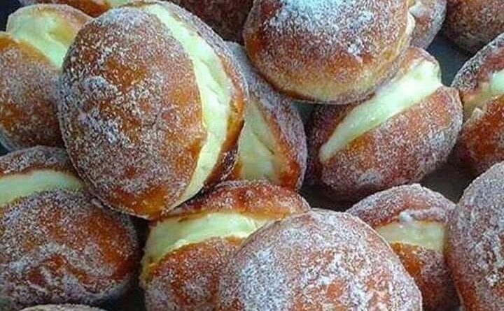 Levar todos os ingredientes ao fogo baixo até formar um creme. Depois do creme pronto acrescentar uma caixa de creme de leite. Rechear os sonhos e passar no açúcar refinado.