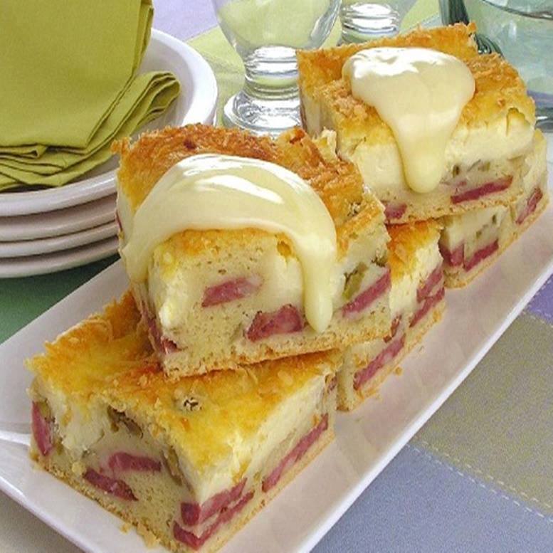 Para o recheio, aqueça o óleo, em fogo médio, e frite a calabresa por 5 minutos. Adicione a cebola e refogue por mais 3 minutos. Junte azeitonas e mexa. Retire e reserve. Bata todos os ingredientes da massa no liquidificador, menos o fermento, até ficar homogêneo. Desligue, adicione o fermento e misture. Despeje metade da massa em uma fôrma retangular pequena, untada e enfarinhada, espalhe a calabresa refogada e cubra com o requeijão. Coloque a massa restante, polvilhe com parmesão e leve ao forno médio, preaquecido, por 35 minutos ou até dourar. Retire, corte em quadrados e sirva, se desejar, com mais requeijão cremoso.