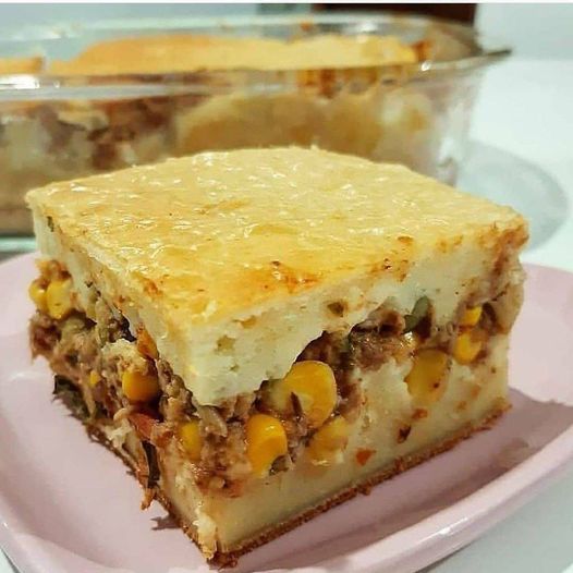 Coloque num refratário untado metade da massa, acrescente todo o recheio e o restante da massa. Levar ao forno pré-aquecido por cerca de 35 minutos ou até que a faca ou palito saiam limpos.