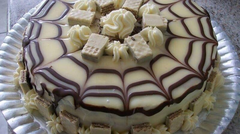 Em um recipiente coloque o chocolate cortado em pedaços e o creme de leite, leve ao microondas por cerca de 1 minuto misture bem e coloque em cima do creme branco. decore com bis branco.
