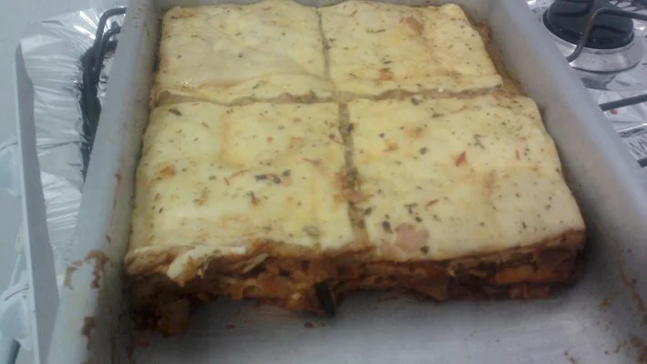 - Montar camadas alternadas, molho, bolachas, queijo.