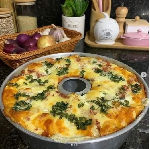 Unte uma forma com manteiga e trigo e coloque metade da massa nela, acrescente o recheio triturado (calabresa e bacon) com o queijo em pedaços e colheradas de requeijão. Coloque o restante da massa em cima e adicione mais recheio, finalize com coentro. Leve ao forno a 180 graus por 40 minutos (até ficar dourado e no ponto do palito de dente sair limpinho quando furar a massa). E está prontinha, fica MARAVILHOSA!