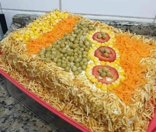 Depois de desenformar, passe maionese em toda torta e pode usar sua imaginação na hora da decoração. Batata palha, tomates, cenoura, milho verde e etc.
