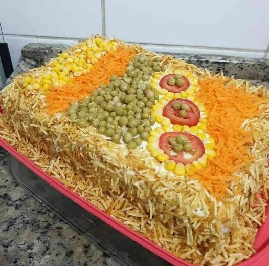 Depois de desenformar, passe maionese em toda torta e pode usar sua imaginação na hora da decoração. Batata palha, tomates, cenoura, milho verde e etc.