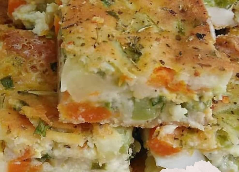 4. Em uma forma untada e enfarinhada, despeje 2/3 da massa, adicione o recheio de legumes e cubra com o restante da massa.