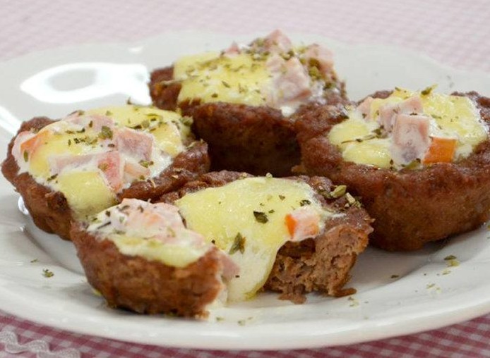 Em uma tigela, misture a carne moída, o pó para creme de cebola, o azeite e o ovo até formar uma massa homogênea. Pegue porções da massa e distribua em forminhas para cupcake untadas, modelando copinhos de carne moída. Coloque em uma fôrma e leve ao forno médio, preaquecido, por 10 minutos ou até ficarem firmes. Deixe amornar, desenforme e reserve.Em uma tigela, misture a mussarela, o presunto, o cream cheese, o creme de leite e divida entre as tortinhas de carne moída. Coloque em uma fôrma e volte ao forno por mais 8 minutos. Polvilhe orégano e sirva em seguida.