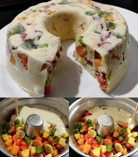 - Coloque as frutas na forma e cubra com o restante do creme;