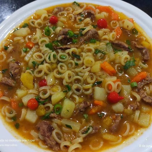 Frite a carne, coloque cebola, alho, sal. Os legumes picados, orégano, páprica, cubra com água e dê uma pré cozinhada nos legumes. Depois coloque o macarrão, acerte o sal e cozinhe em fogo baixo.