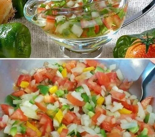 Corte os tomates sem semente em pequenos cubos, corte a cebola em pedaços pequenos, corte o tempero verde bem batidinho, os pimentões e acrescente o sal e por último o segredo, a colher de açúcar.