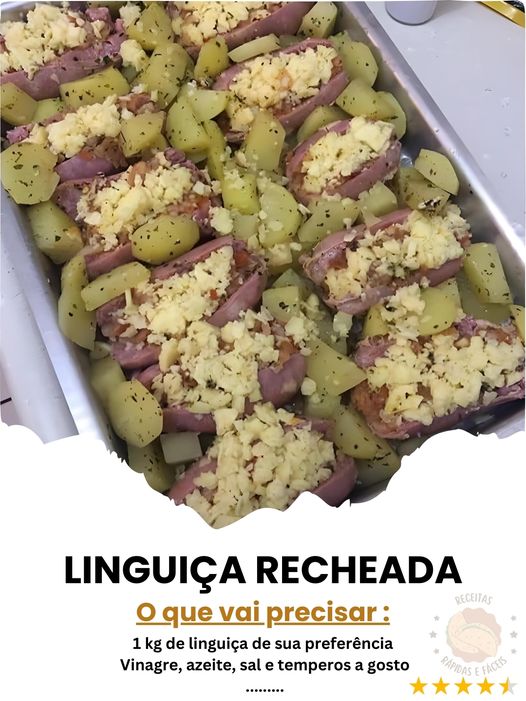 Faça um corte no meio da linguiça e coloque em uma forma untada com azeite e reserve. Em uma vasilha faça um vinagrete com a cebola o tomate e o pimentão e tempere a gosto, recheie as linguiças com esse vinagrete e depois coloque a mozarela ralada por cima de cada linguiça. Sobreponha as batatas nos espaços entre as linguiças, salpique orégano ou tempero de churrasco por cima regue com azeite e leve ao forno por mais ou menos 1 hora em fogo médio