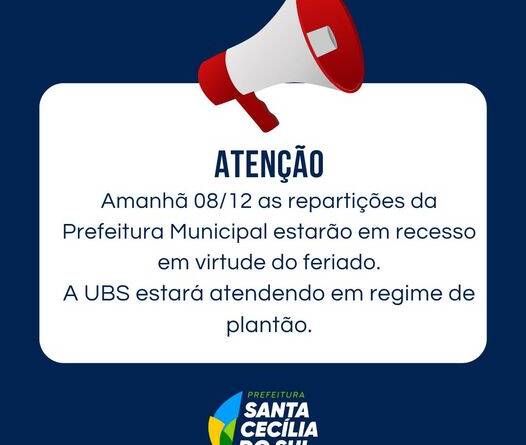 As repartições públicas da Prefeitura de Santa Cecília do Sul estarão fechadas nesta quinta-feira 08/12, em virtude do feriado.