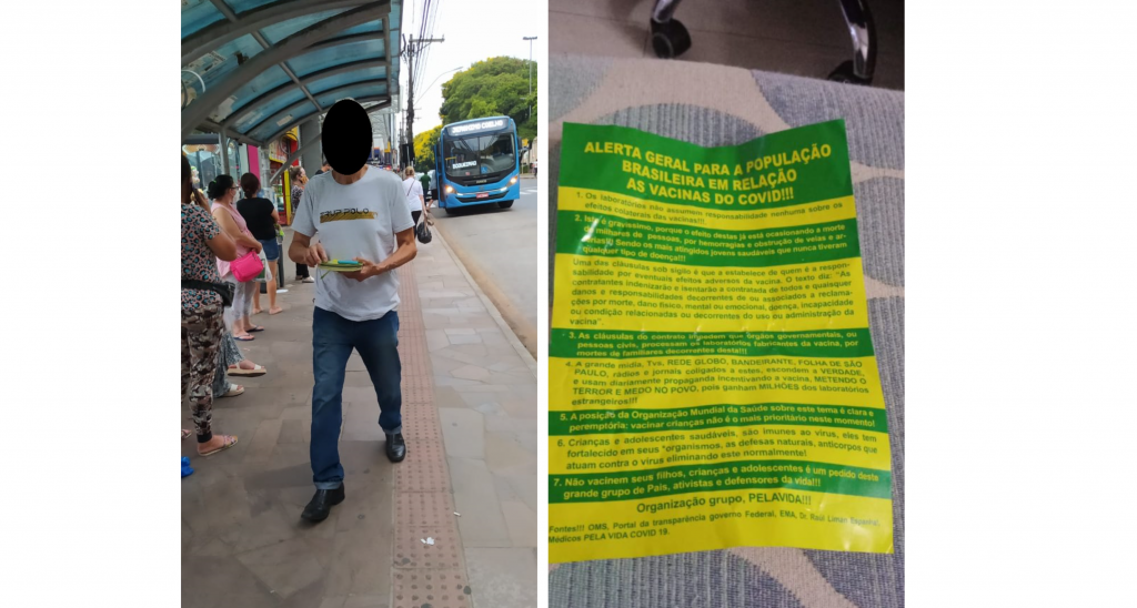 O homem distribuía o material nas paradas de ônibus do centro, com as cores no papel em verde e amarelo e informando pertencer a um grupo chamado “PELAVIDA”.Entre os tópicos numerados no panfleto estão argumentos do tipo: os laboratórios não assumem a responsabilidade pelos efeitos colaterais. Também acusa estes efeitos colaterais de estarem causando a morte de milhares de pessoas, destacando jovens saudáveis como vítimas.