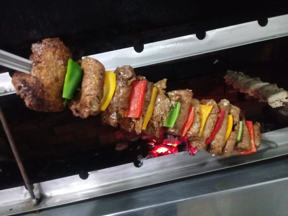 “[Tem] Alguns espetos na mesa, e outra parte na grelha, uma infinidade. Até a polenta com bacon, queijo vegano”, explica o proprietário.