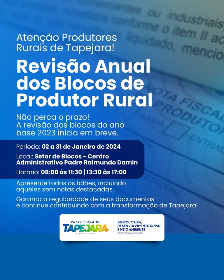 Produtores de Tapejara, a revisão dos blocos de produtor rural para o ano de 2023 está scontecendo, e sua participação é essencial.