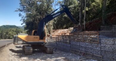 No km 26, em São Valentim do Sul, houve deslizamento de parte da pista. O fluxo está em meia pista.