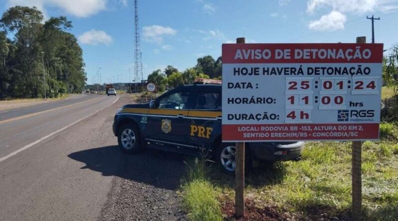 Conforme o comunicado, o km 2 da BR-153, entre Erechim-RS e Concórdia-SC, está interditado desde as 11h e seguirá fechado para o tráfego de veículos até as 15h. O fechamento da pista ocorre para “realização de obras emergenciais e desmonte de rochas utilizando explosivos”.