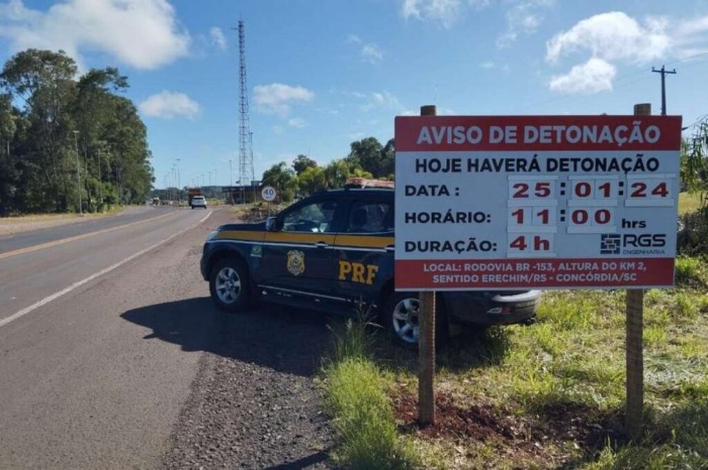 Conforme o comunicado, o km 2 da BR-153, entre Erechim-RS e Concórdia-SC, está interditado desde as 11h e seguirá fechado para o tráfego de veículos até as 15h. O fechamento da pista ocorre para “realização de obras emergenciais e desmonte de rochas utilizando explosivos”.