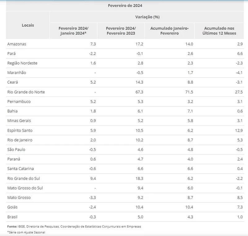 Na comparação com fevereiro de 2023, a indústria nacional cresceu 5,0% em fevereiro de 2024, com taxas positivas em 16 dos 18 locais pesquisados. Vale citar que fevereiro de 2024 (19 dias) teve um dia útil a mais do que igual mês do ano anterior (18). Nesse mês, Rio Grande do Norte (67,3%), Rio Grande do Sul (18,3%), Amazonas (17,2%) e Ceará (14,3%) registraram avanços de dois dígitos e os mais acentuados.