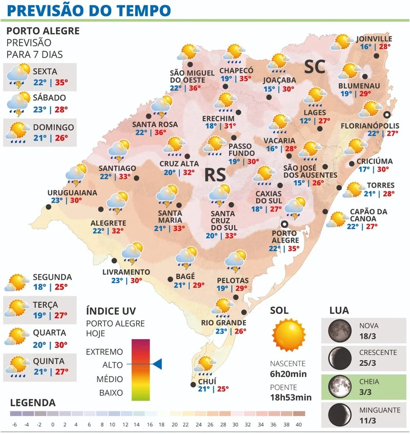 Para o sábado, a previsão meteorológica indica alto risco de vendavais em cidades da Zona Sul e no entorno da Lagoa dos Patos. Áreas da Costa Doce, do Litoral e pontos da Região Metropolitana também estão na área de maior atenção para ventos fortes. A instabilidade deve continuar ao longo do dia, especialmente na Metade Norte do estado.