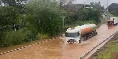 7)BR 285, km 218, em Caseiros, pista parcialmente bloqueada, córrego que passa sob a rodovia transbordando. Local sinalizado.