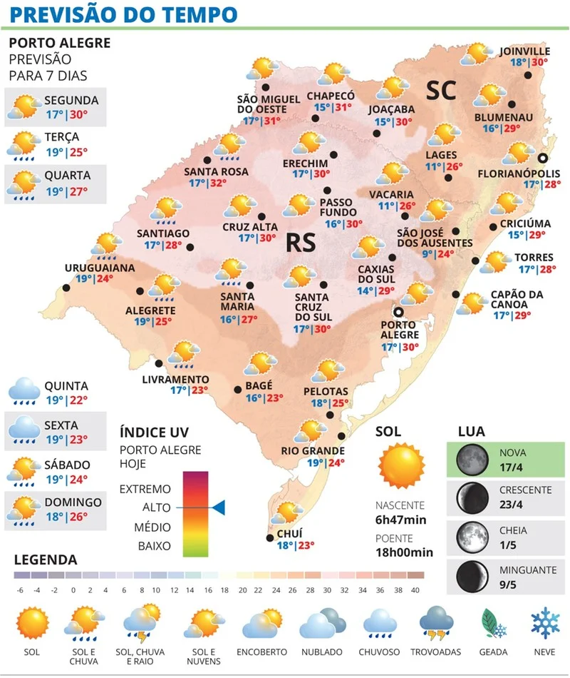 Há previsão de chuva da tarde para a noite em pontos do Oeste, Noroeste, parte do Centro e da Campanha, mas já de manhã não se afasta instabilidade na região de Uruguaiana. A temperatura se eleva menos no Oeste e no Sul, mas nas demais regiões, após um começo de manhã ameno, aquece bastante e a tarde terá um pouco de calor.