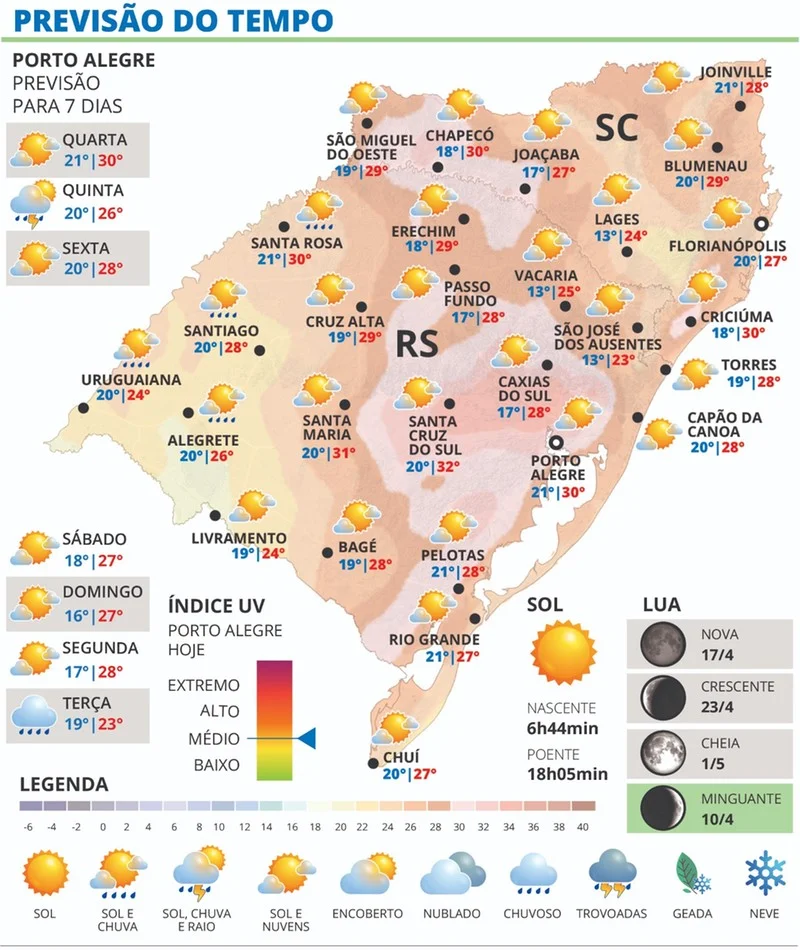 A instabilidade impede uma elevação mais acentuada das temperaturas no Oeste, especialmente na região de Uruguaiana. Já no restante do estado, o calor predomina, com maior intensidade no Centro, nos Vales e na Grande Porto Alegre.