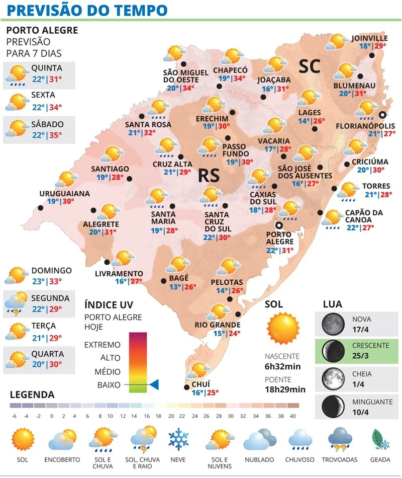 O dia será abafado, com mínimas em torno de 20°C na maior parte do território gaúcho. Em regiões da Campanha e da Serra do Sudeste, o amanhecer ainda tende a ser mais ameno, com marcas abaixo dos 15°C.