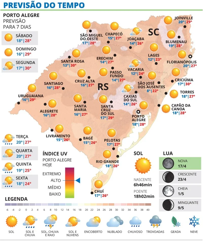 O amanhecer será de temperaturas amenas, com sensação de leve frio, especialmente em municípios de maior altitude. No decorrer da manhã, os termômetros sobem de forma rápida, e a tarde deve registrar marcas agradáveis, com calor moderado em parte do território gaúcho.
