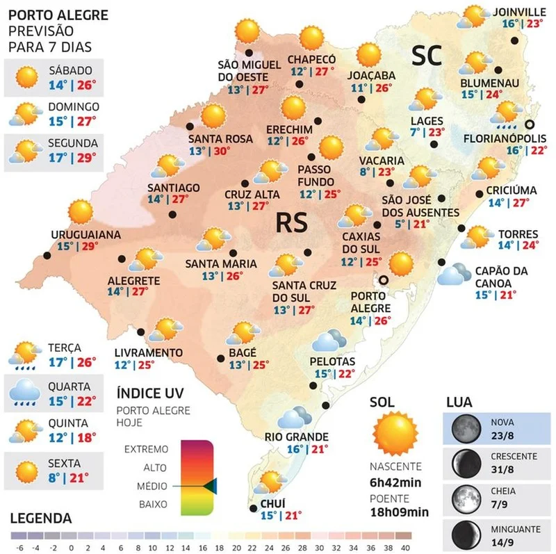 O final de semana iniciará com sol e tempo firme no Rio Grande do Sul, mas o tempo deve mudar no domingo, 31. Conforme a MetSul Meteorologia, o sol aparece em grande parte do território gaúcho neste sábado, 30, e as temperaturas se elevam, com máximas acima dos 25°C.