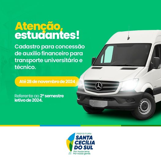 Através da Lei Municipal nº 798/2017, a Prefeitura de Santa Cecília do Sul informa que está aberto o cadastro para concessão de auxílio financeiro destinado ao custeio do transporte universitário e técnico referente ao 2º semestre letivo de 2024.