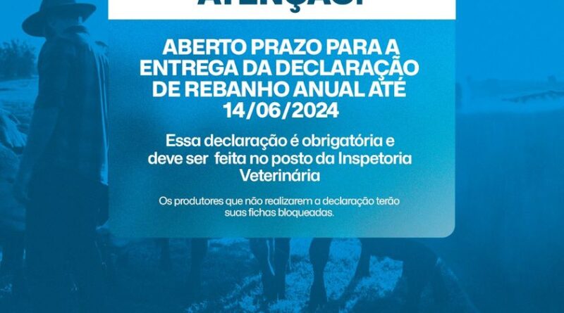 O posto da Inspetoria Veterinária de Santa Cecília do Sul, informa que a Declaração Anual de Rebanhos de 2024 já está em andamento e se estende até 14 de junho.