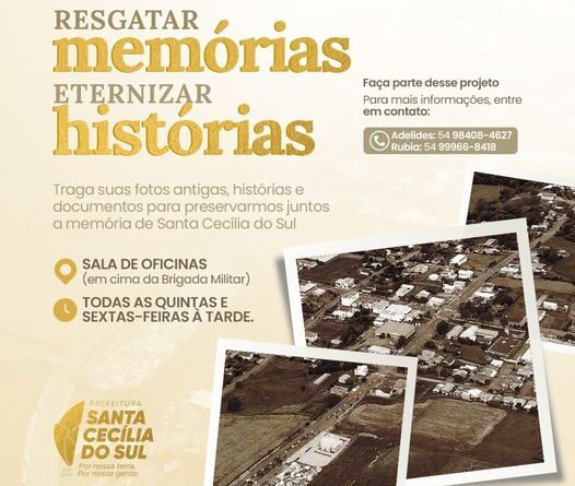 O Município de Santa Cecília do Sul ainda é jovem, mas possui uma história que teve início há quase 100 anos. Cada acontecimento ao longo desse tempo faz parte da memória das gerações que antecederam, contribuindo com exemplos e valores que moldaram o povo de hoje. Sabendo que muitas pessoas têm histórias a serem contadas e momentos eternizados em fotografias, que são preciosas para o resgate histórico de Santa Cecília do Sul. a administração lançou a Campanha “Resgatar Memórias, Eternizar Histórias” e lanço o seguinte desafio para a população: