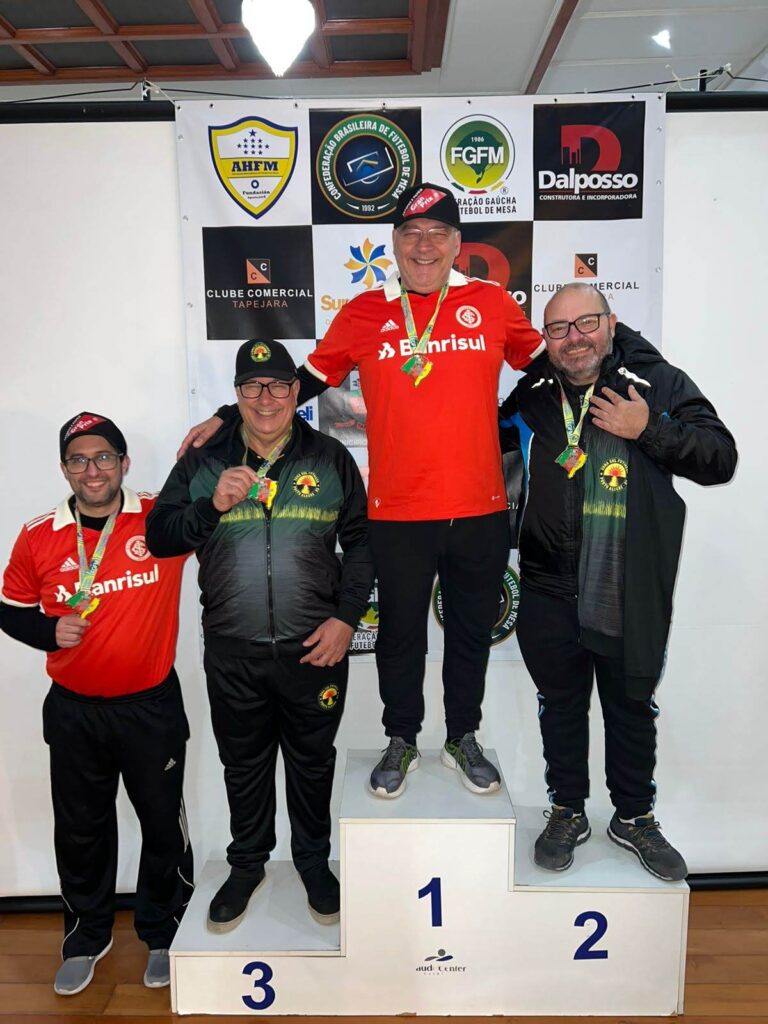 A segunda etapa do Estadual de Futebol de Mesa 2023 – Campeonato Gaúcho da modalidade 12 Toques – marcou a estreia do time colorado no circuito estadual. E o time veio com tudo para Tapejara, cidade sede desta etapa, organizada pela Associação Hortenilense e Federação Gaúcha, levando duas das três taças em disputa (série ouro e bronze) e colocando três botonistas no lugar mais alto do pódio da série ouro – além de Muller e Kopper, campeão e vice, Medeiros foi o 3° colocado.