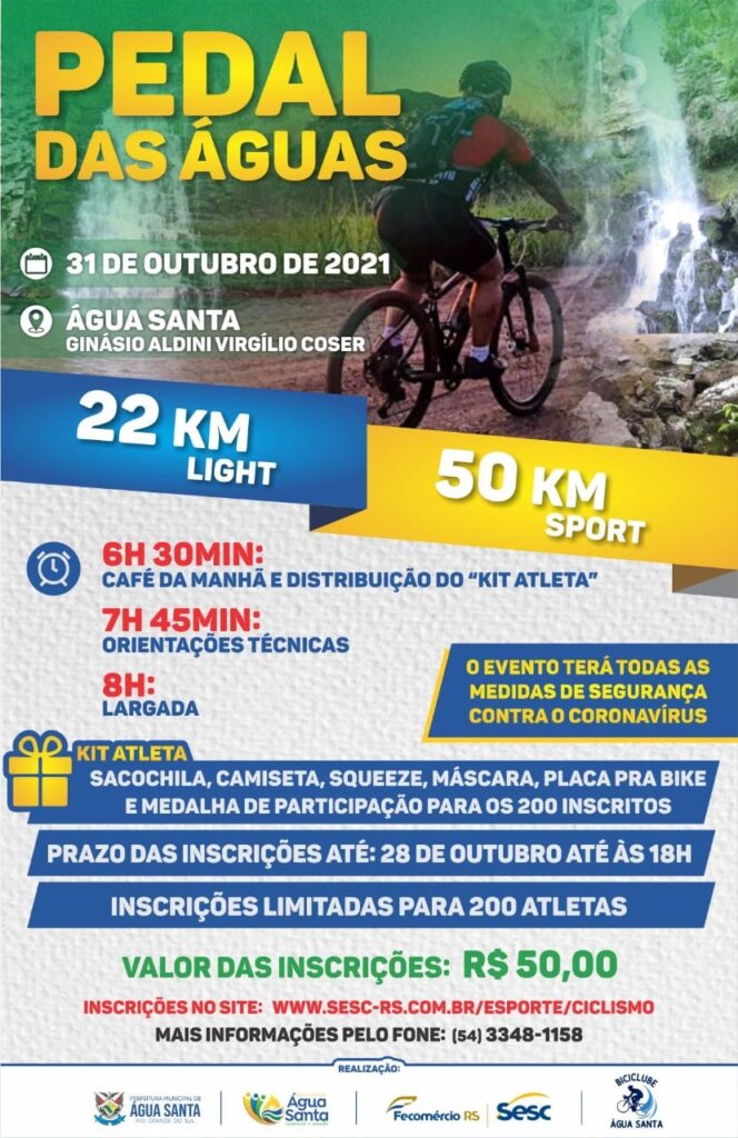 A Secretaria Municipal de Desporto, Juventude e Turismo de Água Santa informa que o PEDAL DAS ÁGUAS acontece no próximo domingo, 31 de outubro.