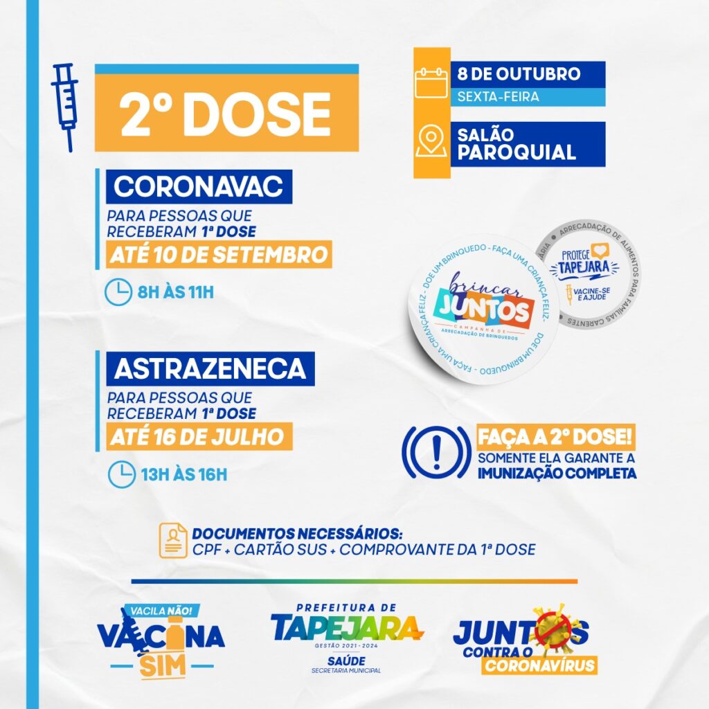 A Secretaria de Saúde de Tapejara promove nesta sexta-feira, 08/10, a vacinação da segunda dose contra a Covid-19 no Salão Paroquial.