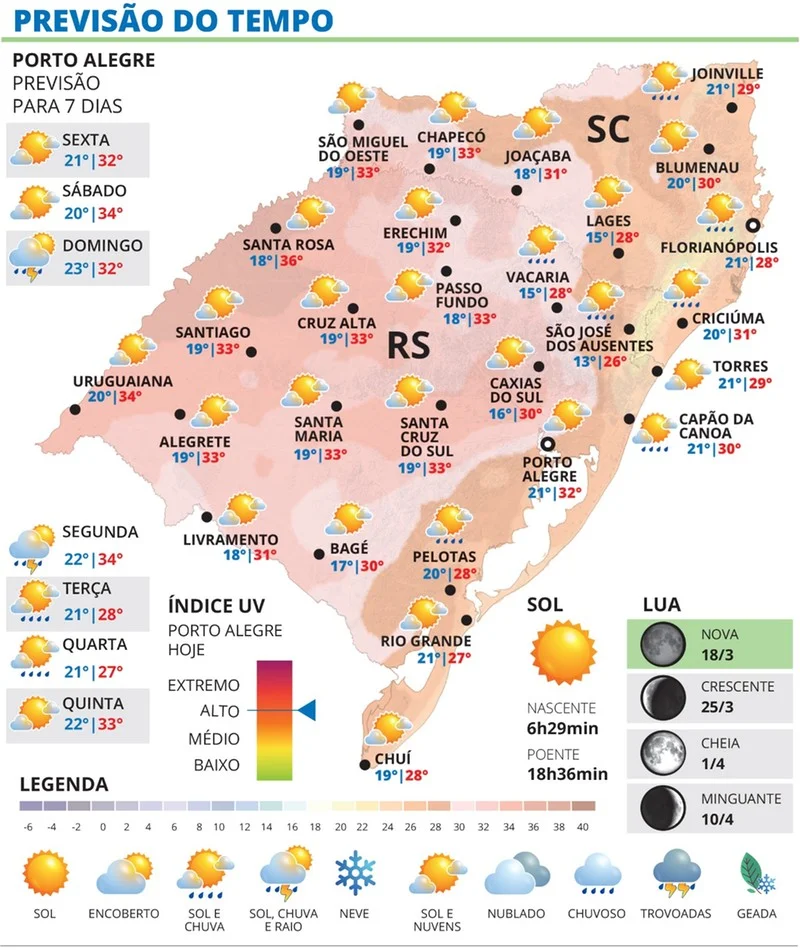 O amanhecer terá temperaturas amenas a agradáveis, típicas da transição de estação. Já durante a tarde, o calor ganha força e traz características ainda de verão: as máximas sobem de forma significativa, com destaque para as regiões Oeste e Noroeste, onde os termômetros podem chegar ou até ultrapassar os 35 °C.